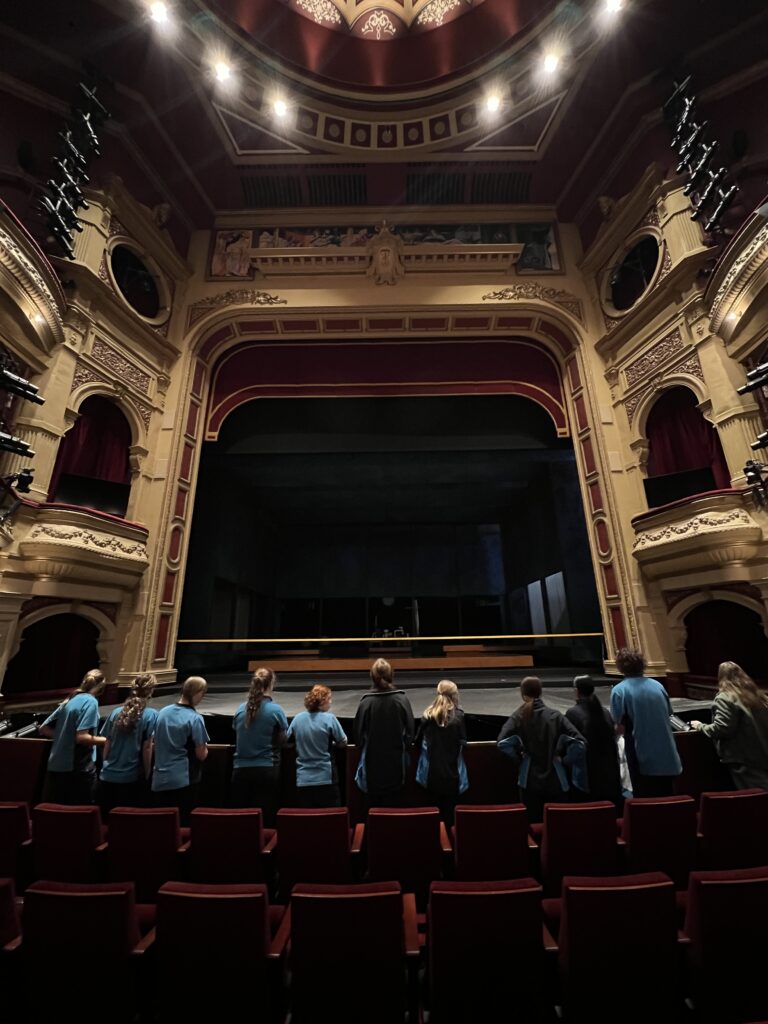 The first thing we did when we arrived was a tour of the theatre. We were taken to the front of the seating area and heard about the history of the theatre. Then we went backstage, where we saw how the props and backdrops worked. We also visited the cast dressing rooms and saw photos of famous actors and actresses who had performed there.