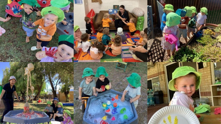 Introducing sustainability to toddlers. We role model how to put leftover scraps and recycled materials into different coloured coded bins. The children had the opportunity to head out into the Wild Space Area to visit the garden and explore nature. They take turns at the fountain, filling up watering cans and containers before transferring them over to the garden beds.